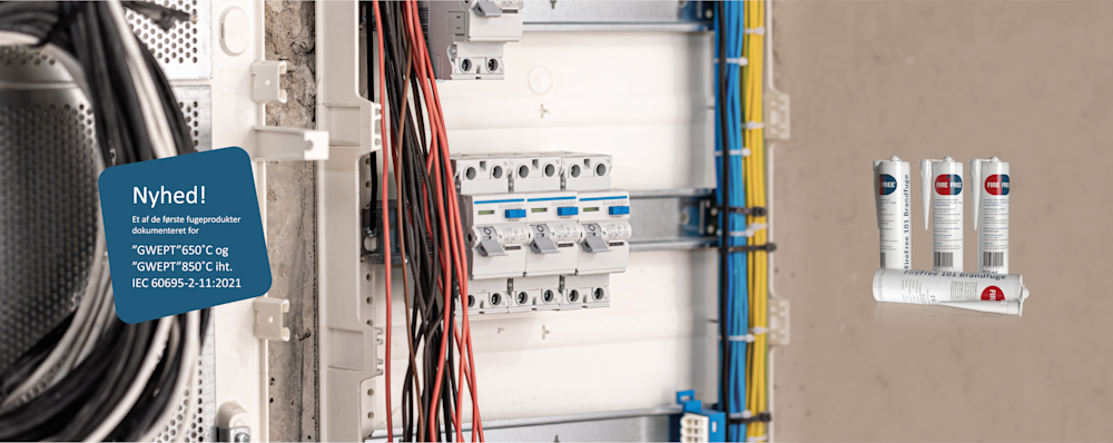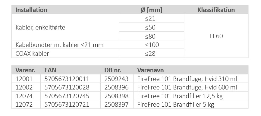 FireFree 101 Brandfuge er dokumenteret for brandlukning af installationsgennemføringer i brandadskillende bygningsdele og kan derfor ligeledes anvendes, hvor kabler føres igennem en brandadskillende bygningsdel bag tavlen.