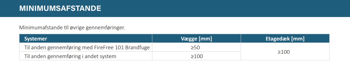 Er der boret et nyt hul i den brandadskillende konstruktion og du skal udføre en ny brandlukning, så husk at tage højde for respektafstanden til de andre installationer. Herunder ses et eksempel på minimumsafstande som angivet i installationsvejledningen på FireFree 101 Brandfuge.