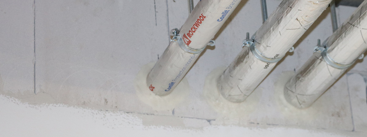 Billeder herover: Korrekt udført løsning for brandlukning af stålrør med rørisolering i mineraluld ≥200 mm ud fra væg, understøttet af bæring og monteret iht. Scandi Supply’s installationsvejledning.
